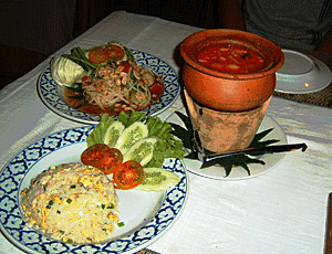 | 夕食は「歩き方」に紹介されていたお店 古い建具や家具などを集めた薄暗いお店 2人で3品頼む 右のお鍋がトム・ヤム・クン 「唐辛子はなしにして」・・・・と言わないと激辛が 出てくるそうなので、注文は息子にお任せ 唐辛子なしでもピりッとして ココナツの味もタイ米のチャーハンもおいしい!! 気に入った〜 (日本に帰ってからも何かと唐辛子を入れないと 気の抜けたような料理になってしまう ・・・・と思い、ピリカラ料理を作るようになってしまった〜) ビールは高いが、おいしい食事とこの暑さには必要 256B(768円)で大満足!! ・・・・・・・・・・・・・・・・・・・ 夕食後、 娘に「無事」のメールを送りに出かける インターネット1分0.5B(15円) 慣れないパソコンで手間取る いったん私をゲストハウスに送り届けてから 息子はもう一度インターネット・カフェへ 眠くてできなかったといって早めに帰ってきて就寝 明日はチェンマイに滞在 日帰りツアーは明後日にする |