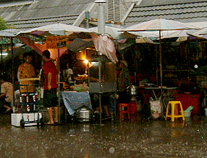 | 暑さと人の多さに疲れ果てて 帰ろうとすると、 またまたスコールの来襲 15:50 アーケードの隙間から 雨は落ちてくるわ 店の間の排水溝があふれ、 通路が水浸しになるわ ・・・で、止むのを待つ 待っていれば止むと思いながら アイスクリーム(1個12B=36円)を 食べながら待つが 今日はなかなか止まない 1時間待っても止まないので 小降りになったところを見計らって 走ってモノレールの駅へ 17:00 モノレールは冷房がきつく 涼しさを通り越していた |