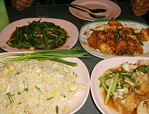 | おいしい中華風タイ料理 お風呂に入ってさっぱりしてから、息子はまたお仕事へ 私は隣接のデパート1階のスーパーでビールを探す 夕食は一緒に・・・の予定なので おいしそうなものもあるが目をつぶる ビールはおいしいが、ついでに購入した緑茶は なんと砂糖入り・・・ 22:00近くになって息子が帰宅 これから中華街の屋台体験に出かける・・・と ちょっと遠いのでタクシーで この界隈だけはこんな遅い時間なのに大賑わい 屋台といっても大掛かりな構えで 赤・青・緑の3色の店員の制服姿が目に入る それぞれ赤の店・青の店・緑の店と縄張りが決まっているようである そのうちの赤の店に入る ・・・・・・・・・・・・・・・・・・ お皿はピンクのプラスチック 色彩感覚はどうなっているんだろう お料理は2人で4皿 食べきれないほど 味はどれもおいしいが、テーブルの下が汚い ゴミ箱がテーブルの下にあって カニの殻などもそこへポイポイと捨てるのだという うまく入らないで周りに散らばっている それに食べ残したおかずも 食べ散らかしたままで席を離れるので 味との落差が激しい ・・・・・・・・・・・・・・・・・・ 店員は、お皿に残った食べ物をゴミバケツ?にぱっと投げ入れる その横で食事を味わう・・・・という感覚についていけないのは まだタイでの日が浅いからかも おいしくて食べ過ぎて、後で苦しくなったほど これで610B(1830円) 流しのタクシーを拾ってホテルへ 23:05着 明日の予定を確認して就寝 胃薬も入らないほどだ・・・といって苦しんで眠る息子 |