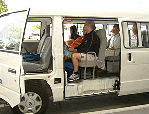 | シティバスに乗り換えて バックパッカーズへ 荷物は後ろの牽引車に積み込む お客の要望を聞いて、 玄関先まで送ってもらえるシステム (ドロップ・オフ) |