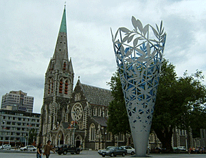 クライスト・チャーチの大聖堂と その前の大きな聖杯(チェリス)の モニュメント |