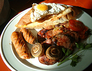 | パッキングしてチェックアウト ザックを持って町でブレックファースト 大きなソーセージ・カリカリベーコン・ 大きなマッシュルーム・焼きトマト・ トーストしたフランスパン・目玉焼き と盛りだくさん プラス紅茶 初めての朝食の外食メニュー |