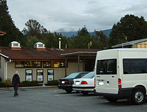 | トラックネットのバスが 7:00に迎えに来てくれる YHAの入り口で待つ 空は、曇っていて天候はよくない 稜線も見えず |