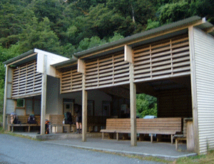 ディバイド峠のシェルター 水洗トイレつき 部屋もあるが、 泊まってはいけない・・・と張り紙 |