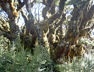 | レイク・マリアンが見える地点まで 行ってみたが、さっぱり見えない 道はまだ続いているので どんどん進んでいったが 行けども行けども湖は見えない どうやら一般登山道ではなくなったらしく 未整備なので引き返す 大きな太い木に茶色のコケがくっついて 不思議な様相 |