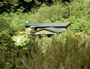 | ハウデン小屋 キー・サミットからもとの分岐に戻って しばらく行くと、川のほとりに建っていた |
