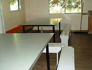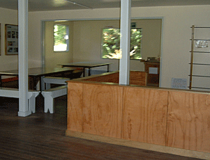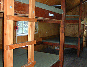 | マッケンジー・ハットのバンクルーム ちょっと遅く着いたので、 日当たりのいい1人用のベッドは すでになくなっていて 4人用の広い場所が開いているのみ まず、シュラフを広げて、 自分の場所を確保しておく |