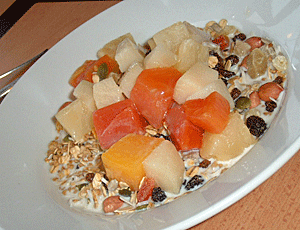 | トーマスホテルの朝食 ここだけ朝食つきで109$(2人で) 1人にすれば4100円か シリアル(ミューズ)とトースト・紅茶 このミューズはあごが痛くなるほど 噛み締め噛み締め 食べなければならない とうとう最後まで食べ切れなかった ニュージーのバターはおいしい 三角形の固まった状態で出されるが 口の中に入れるととろーりと溶ける |