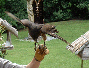 | 「キーウイ・バードライフ・パーク」 1日2回、コンサベーション・トーク (ステージでのショウ)があり、 タカの仲間が披露された 係員2人の間を、観光客の頭すれすれに 飛んでみせる |