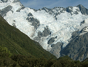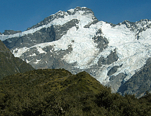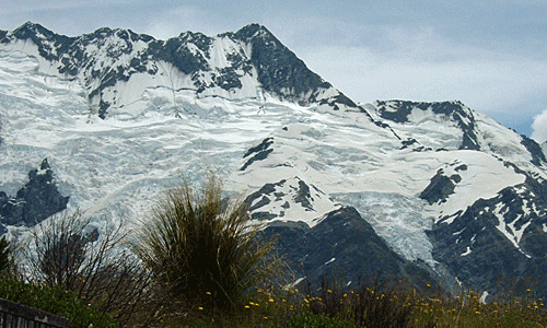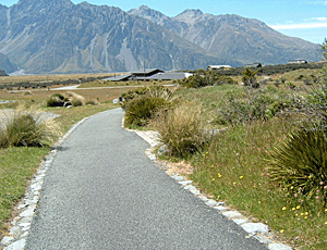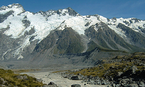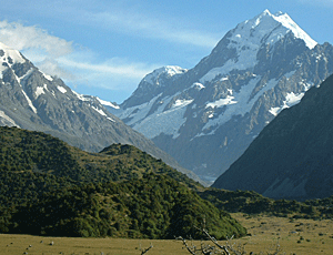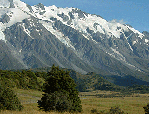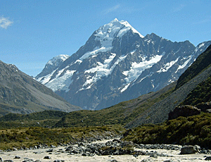 | 今日のコースは、 マウントクックは山の陰に隠れて見えない 代わりにマウント・セフトン(3151m)や マウント・フットスツール(2764m)が 良く見える |