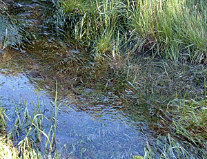 | 氷河もくっきりよく見える | 今日は分岐を右折して キャンプ場を通って フッカー・バレーのほうへ進む キャンプ場の水源はこれか? と思うほどの澄んだせせらぎ |