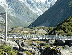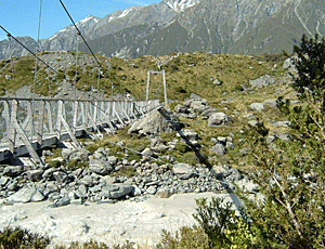 2つ目の吊橋 これを渡るとやっとマウントクックが 見えてくる 橋の下は、フッカー氷河から流れてきた水 泥色をしている |