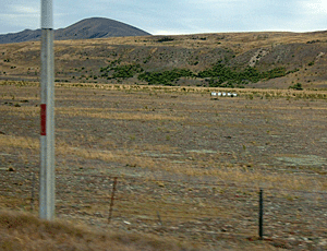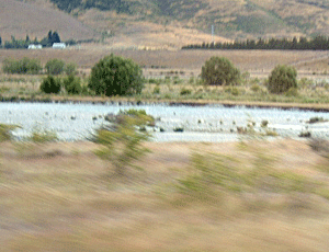 マウントクックからクイーンズタウンへ バスで移動 バスの中から見た景色 牧草地が広がる バスは100km/hで突っ走る あれ?スピードがおちたな?と思うと街中 50km/hに減速 |