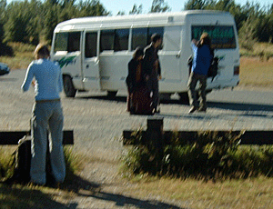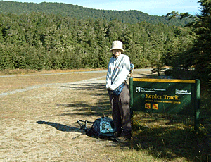 緑色の標識がDOC管轄のトラック であることを示している 帽子・長袖・手袋・長ズボンという 出で立ちは我々日本人のみ そのほかは、タンクトップや短パン姿 紫外線がきついという国なのに かまわない人がほとんど |