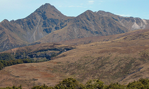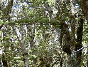 | 白っぽい樹林を抜けると稜線に出た〜 遠くの山が、マウント・ラクスモア その手前に今日の宿の ラクスモア・ハットがある |