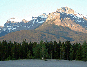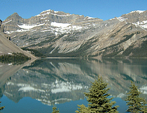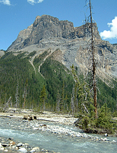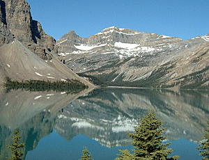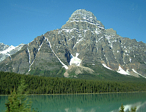 アイス・フィールド・パークウエーにでた 右側の川はおなじみのボウ川 その川の向こうに鉄道が走っている 貨物列車の数は百両くらいあるそうだ ここは単線なので 待避線でひっそりと延々停まっているのを 数回見た 一両が日本のより長いというから ずいぶんの長さを引っ張っているわけ |