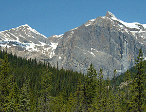 車はバンフ方面へ南下 車の中から雲ひとつない空を背景に ブラック・ピラミッドを撮る |