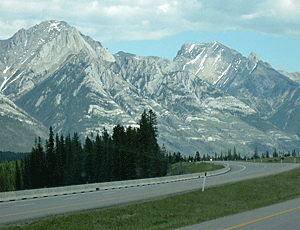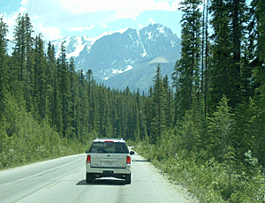 帰りの助手席に乗らせてもらった 前方がよく見えること! カメラも撮りやすい アイス・フィールド・パークウエーへ 向かう道 |
