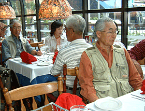 スイスレストランでお別れ会を兼ねる アルパインから白ワインと ロッキーのバンダナを記念に貰った 明日は5時起きの6:30出発 朝食を食べる時間がないので お弁当朝食になる・・・と |