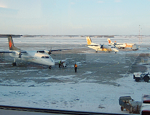 エドモントン空港も 外へ出て歩かなければならない 寒いこと!! 「最後の寒さですよ」と阿南さん 8:45頃、日の出 エドモントンには9:00過ぎに着 |