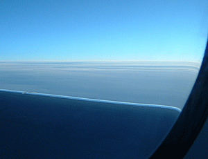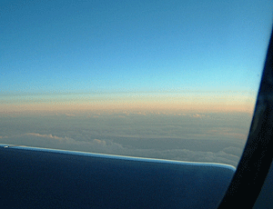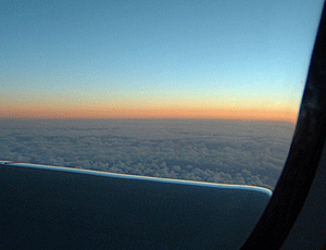 | 飛行機の中から だんだん暗くなって夜になるはずが だんだん明るくなるというのも 不思議な感覚 20:10頃、日付変更線を通過 |