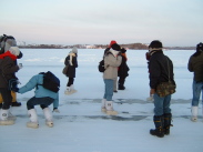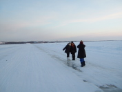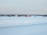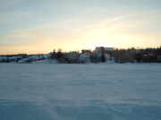 | 市内観光 アイスロード グレート・スレイブ湖が氷結して 1月中旬〜3月中旬のみ通行ができる・・・と それ以外の季節は、対岸まで ぐるっと回っていかなければならない デタ村(先住民の村)まで 6kmのアイスロードとなる 湖の上に立って湖岸の景色を撮った |