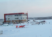 | 13:40から市内観光へ これは州立法議事堂(たぶん) イグルーを模している・・・と やまみやさんが運転手もする ガイドもするといった観光 今日はビデオスタッフも同行して 市内観光や夜のオーロラ観賞を ビデオに収め、希望者に売り込む・・・と やまみやガイドは イエローナイフの観光手引きを 全て暗記しているらしい とても詳しい解説だった 建築資材を現地で調達できないので 運搬費用に莫大な経費がかかる・・・と |