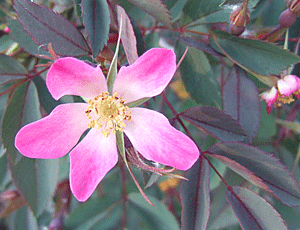 葉が赤っぽいバラ 生垣のように植えてあって 背もかなり高い |