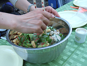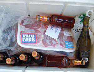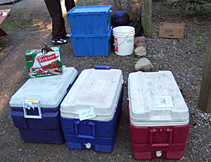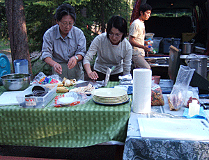 食料からフライパン・鍋・ガスコンロ・ ゴミ缶・なた・水タンク・包丁・皿・ナイフ・ フォーク・スプーン・調味料・ガスボンベ ・・・など、すべて車に積んであった 食料は主に冷凍食品で便利 |