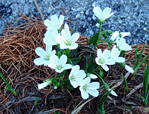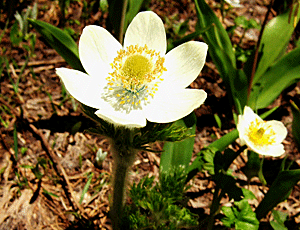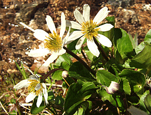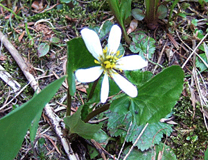 目玉焼きの花 「White Glove Flower ホワイト グローブ フラワー」 とよく似ているが、もっと毛深く 葉ももじゃもじゃしている 雪が解けたばかりの地面の様子 |