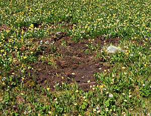 この根はグリズリーの好物 掘り返して食べた跡がまだ新しい |