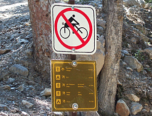 自転車乗り入れ禁止 そのほか、犬は禁止・・・と言う標識もあった が、これらの標識がないトレイルは OKということ? |
