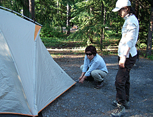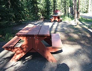 野生動物の侵入を防ぐため 周囲を電流の流れている鉄線で 守られた1画が大キャンプ場 指定された区域には 必ずテーブルと竈がある 隣との間隔も広く、木立もあって 静かに暮らしよくできている |