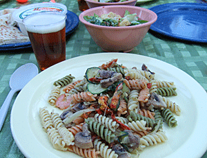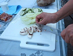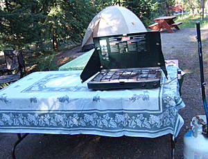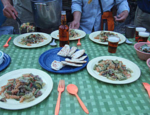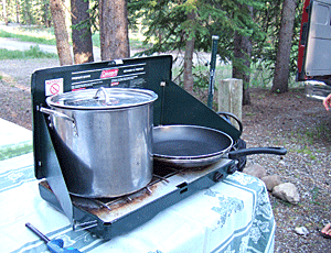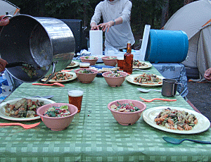 小型のプロパンガスで調理 ガスコンロは、風があっても 弱火でも消えない優れもの 今日のメニューはパスタ |