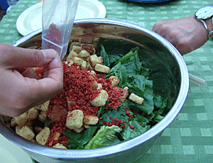 蛇口つきの水タンクから水を流しながら 野菜を洗ってちぎる |