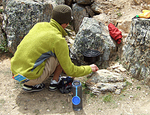焚き火をして暖をとる