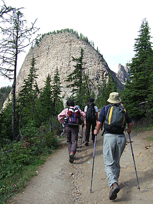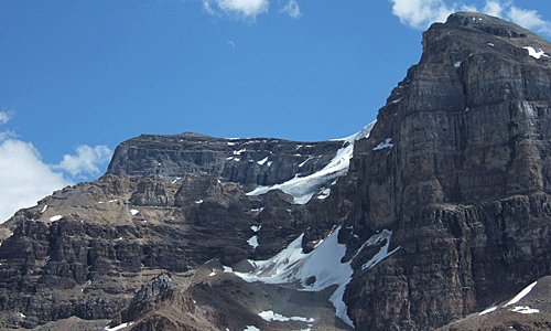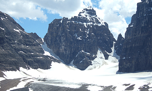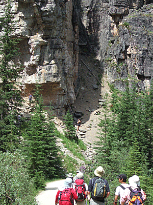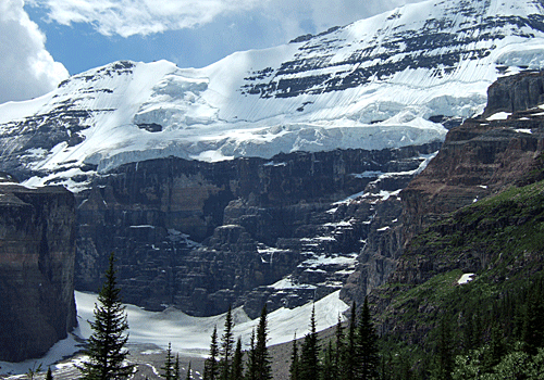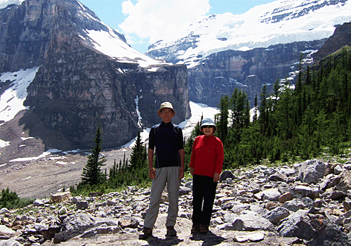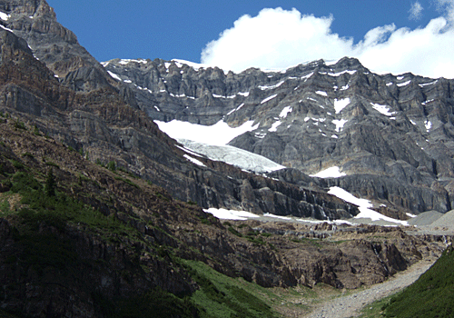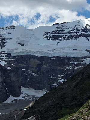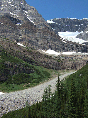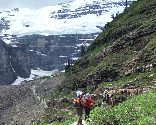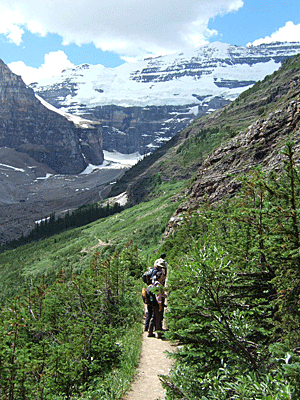 レイクルイーズの奥に見えていた ビクトリア氷河 いったん下って 氷河から流れる川沿いに緩く登っていく |