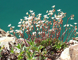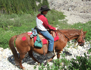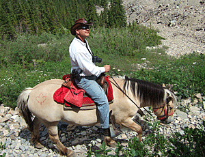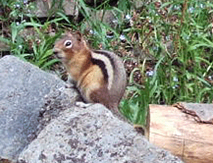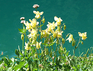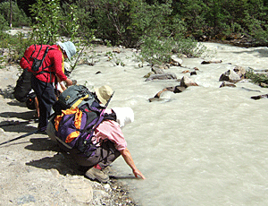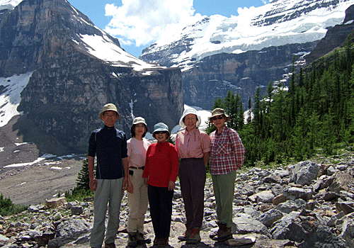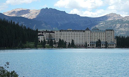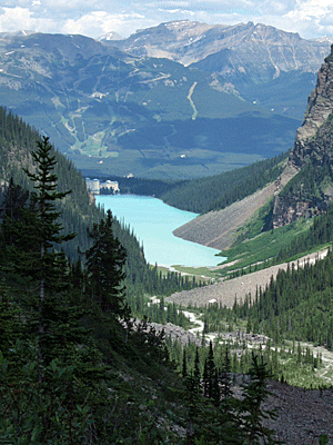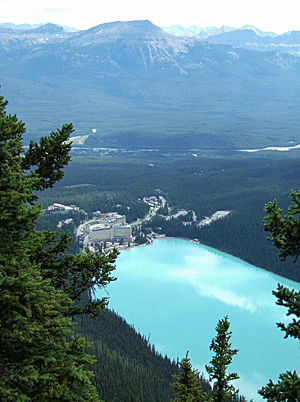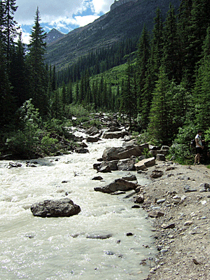 この川がレイクルイーズへ流れ込む ・・・と、茶色がターコイズブルーに変わる 氷河の融け水と一緒に岩粉が流れ込み 大きなものは湖底に沈み 小さいものは水中を浮遊している そんなところへ太陽光線が入り 岩粉にぶつかると 光線の中の波長の短い青や緑が反射して あんなきれいな色になる・・・だって |