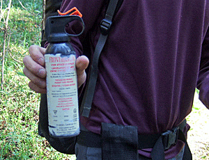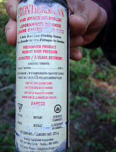 熊にあったら逃げないこと ・・・えさだと思って追いかけてくる 僕の後ろに固まること ・・・自分より大きな敵だと思わせる ↓ ゆっくり後退 ↓ それでも駄目なときは、これを噴射 ガイド氏はいつも拳銃のように腰につけていたそうだが 私はいつも最後尾から歩いていくので 彼が装着しているのを知らなかった 風下から噴射しないように!・・・と |
