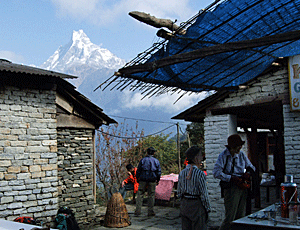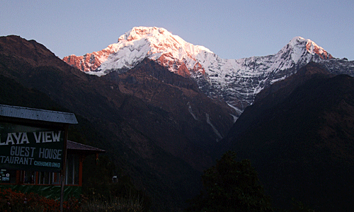 | アンナプルナ・サウスと、ヒウンチュリの朝焼け ゲストハウスの屋根の向こうに 赤く輝く山が見えた |