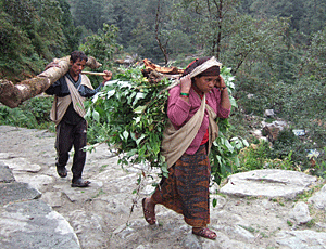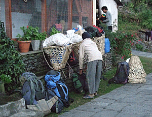 | 出発の用意 ポーターは足元がぞうりでも 難なく担いでしまう |