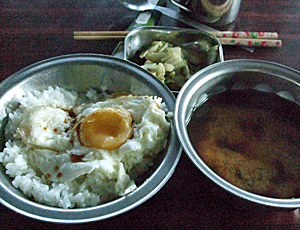 | 今日の朝食 卵かけご飯!と味噌汁 お醤油は、 味にうるさい人が日本から持ち込んだ 上等の醤油を頂く |