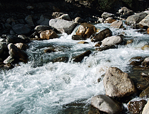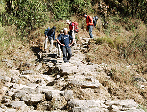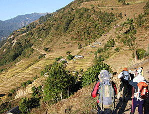 流れの早い川を渡って チョムロン(2170m)から キュムルン・コーラまで(1780m程) どんどん下ってきて 今度は対岸をどんどん登って はるか上のランチ・プレイスへ行く ゴビンダさんが はるか向こうの山の上を指差して 「今日のランチ・プレイスはあそこ」 ・・・と言った時、 私の英語の聞き間違いかと 思っていたのに、本当だった! |