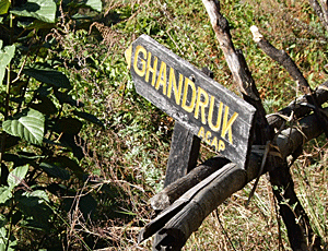 ガンドルックへ ガンドルック=ガンドルンだと いろいろな看板を見て分かった) こういう標識はめったに立っていない ガイド無しのトレッキングは 大変だと思う 実際、行きにランドルンで 出会った人は ガンドルンへ行きたかった ・・・と言っていた 2つの村は谷を挟んで とてつもなく離れている |