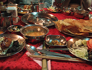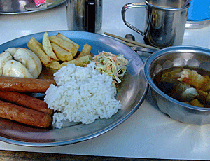 | 豪華版のディナー メニューは ・トマトスープ ・パーパル(パリパリせんべい) ・とろろ ・酢の物 ・ハヤトウリ ・とんかつ (チキンらしいがキャベツもあった) ・ヤギの焼肉 ・白いご飯 ・フルーツ 今日も完食 |