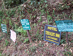 ホテルの案内板 ガンドルンの村の入口には ホテルやゲストハウスの案内が たくさん並んでいた 大きな集落だと分かる |