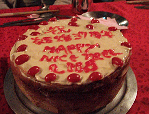 結婚37周年記念に このご夫婦は、トレッキング中に 結婚37周年を迎えられたので 記念のケーキと 絵の堪能な参加者からの お祝いカード (それに参加者全員で寄せ書きをした) ・・・の進呈式が計画された |
