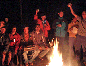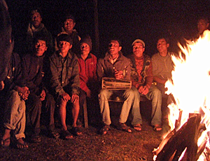 トレッキング終了パーティー 少し雨もぱらついたが 焚き火を囲んでのセレモニー ・ガイドやポーターたちへの ボーナス進呈 ・最年長の方からの感謝の俳句 (ディビさんが通訳) |