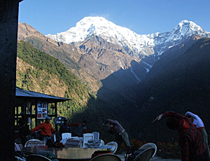 | トレッキング地図 一番右が、マチャプチャレ(6993m) その左側が、ヒウンチュリ(6441m) そのまた左が、 アンアプルナ・サウス(7219m) この3山は、もうすっかりおなじみ |