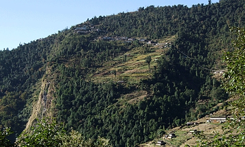| 出発した所は・・・ 振り返ると 今朝出発したチョムロンの村が 小さく小さく見える |